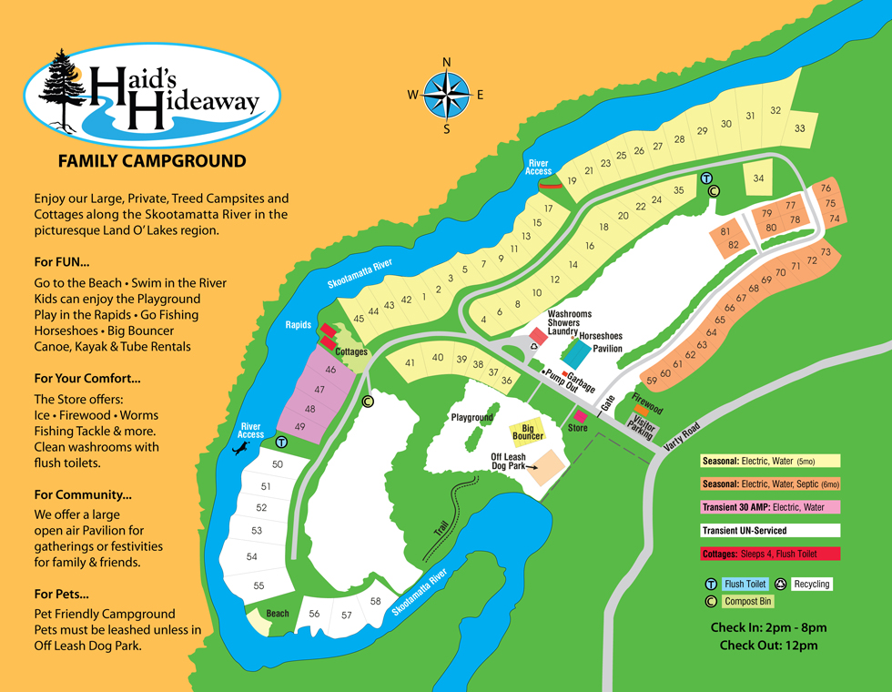 Experience the beautiful Skootamatta River while you camp overnight or by the season. Located in the Land O’ Lakes region we offer Large, Private, Treed, Riverfront Campsites, Cottages and a family-friendly atmosphere.